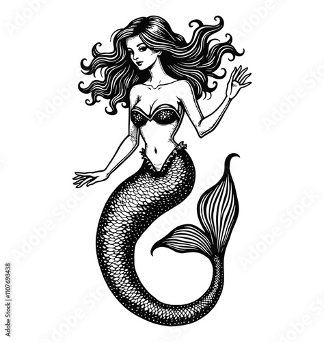 mermaid engraving black and white outline
