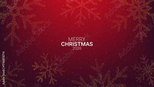 Merry Christmas 2026 greeting card with sparkling golden snowflake pattern on a festive red background for holiday celebration.