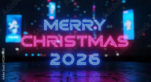 Merry Christmas 2026 Neon Sign in a Futuristic Cyberpunk Cityscape.