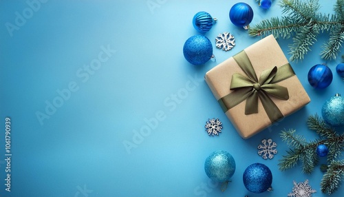 Merry Christmas and Happy Holidays greeting card, frame, banner. New Year. Noel. Christmas ornaments and gift on blue background top view. Winter xmas holiday theme. Flat lay