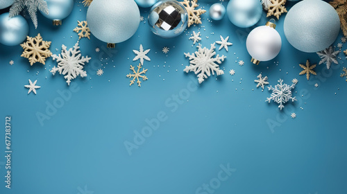 Merry Christmas and Happy Holidays greeting card, frame, banner. New Year. Noel. Christmas white and golden ornaments and gifts on blue background top view. Winter xmas holiday theme. Flat lay.