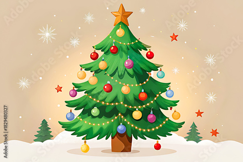 Merry Christmas greeting illustration with glowing stars, holly and festive lights