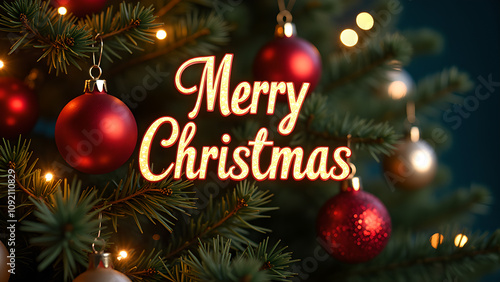 Merry Christmas text on decorated Christmas tree. Holiday season concept.