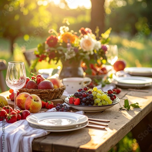 Mesa de picnic campestre con frutas de temporada, vajilla artesanal, luz de tarde, estilo rústico y elegante