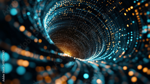 mesmerizing abstract wave of technology, featuring glowing blue and orange particles swirling in dynamic tunnel. This captivating visual evokes sense of depth and movement