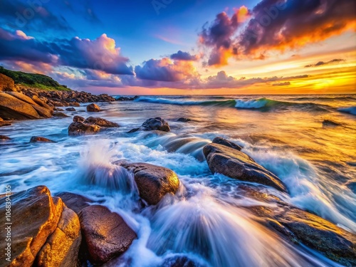 Mesmerizing Low Light Photography of Waves Gently Sliding Over Rugged Rocks on a Serene Seashore at Dusk, Capturing the Beauty of Nature’s Coastal Landscape