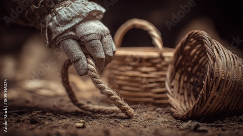 Messy Pet Corner concept. A hand reaching for a woven basket on a textured surface, evoking rustic charm.