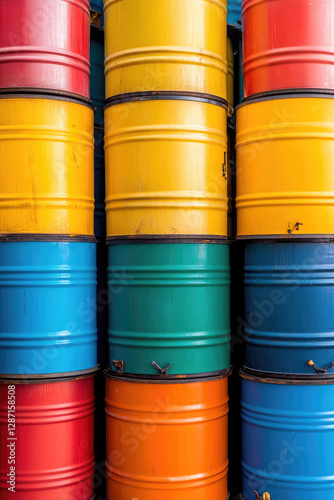 Metal fuel barrels in different colors, stacked in storage. Fuel storage.