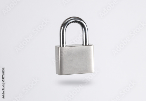 Metal padlock levitating on gray background with shadow