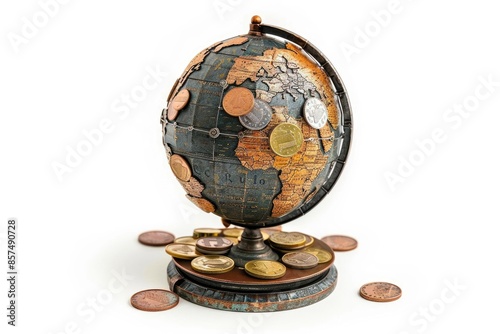 Metal puzzle globe with euro coins on white background