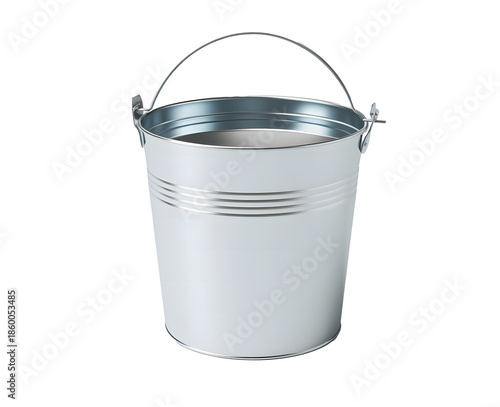 Metallic Bucket: A clean, metallic bucket, designed for various practical applications, stands against a seamless background, symbolizing utility and functionality.