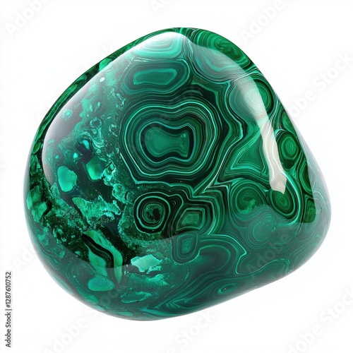 Metallic green polished malachite gemstone with swirling patterns isolated on white