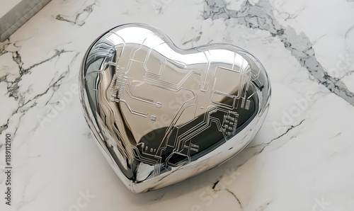 Metallic heart with circuit board design on marble.