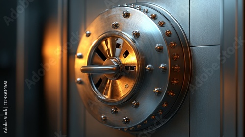 Metallic vault door, security, opening, illuminated background