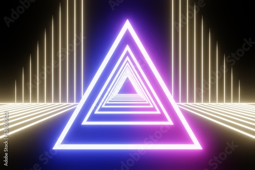 Metaverse digital cyber concept abstract background. 3d rendering futuristic triangle neon light with gold light line