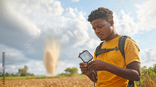 Meteorologist Recording Weather Data Near Cornfield with Tornado in Background