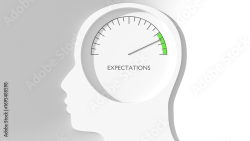 Meter with the word expectations represents the surpassing of expectations of the people. Customer or businessman head with scale. 3D render.