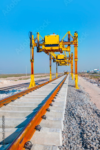 Metro (train) construction site, railroad track installation machine is in use