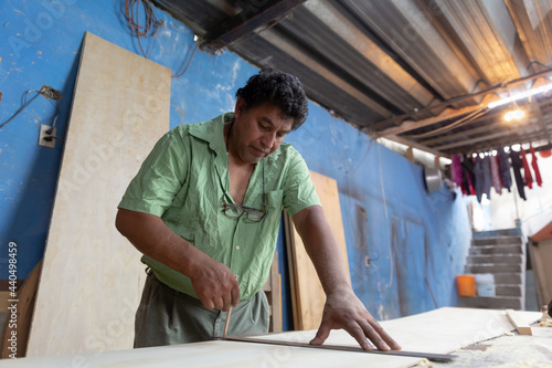 Mexican woodworker, carpenter working in his workshop