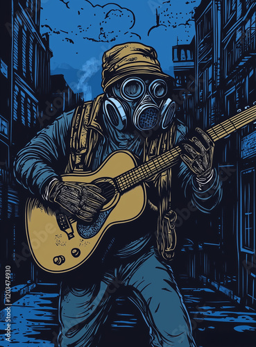 Mężczyzna, gitarzysta w masce gazowej grający na gitarze na ulicy, ekologia, linoryt