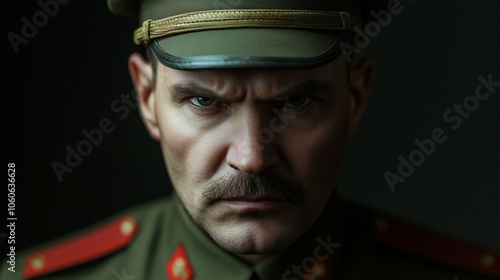 Mężczyzna w wojskowym mundurze, z wyraźnymi odznaczeniami, patrzy prosto w kamerę z pewnością siebie i siłą.