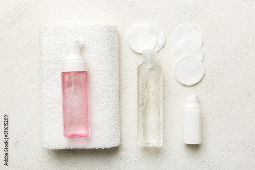 Micellar cleansing water and discs to remove cosmetics and cleanse the skin on colored background. Copy space top view