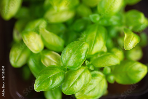 Microgreen foliage background. Close-up of microgreen basil in 6 days. Germinating seeds at home. Vegan and healthy food concept. Sprouts are obtained from high quality seeds from organic plants
