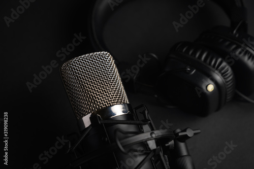 Microphone for podcasts and studio headphones on a black background, horizontal frame