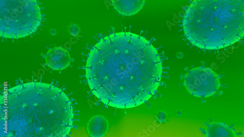 Microscopic COVID-19. 3D render illustration. Dangerous flu strain cases.