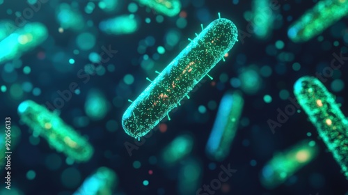 Microscopic View of Glowing Bacteria Cells in a Dark Background, High-Resolution Image of Microorganisms, Scientific and Medical Research Concept, Bioengineering and Biotechnology Illustration