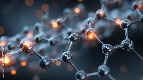 Microscopic view of molecule structure glowing atoms connected by bonds science technology