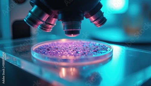 Microscopic view of purple specimens in petri dish under microscope. Science research in lab. Medical examination of cells for disease diagnosis and treatment discovery.