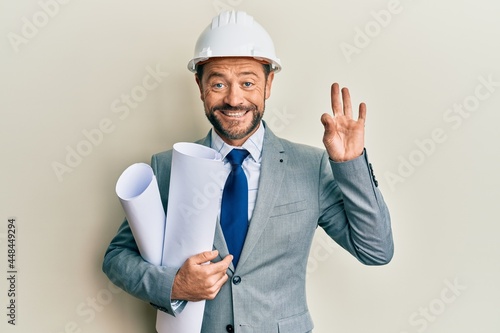 Middle age architect man wearing safety helmet holding blueprints doing ok sign with fingers, smiling friendly gesturing excellent symbol