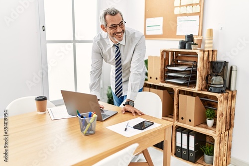 Middle age grey-haired man call center agent smiling confident working at office