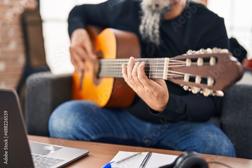 Middle age grey-haired man musician having online classical guitar class at music studio
