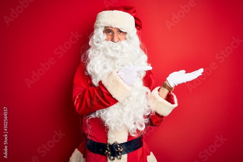 Middle age handsome man wearing Santa costume standing over isolated red background amazed and smiling to the camera while presenting with hand and pointing with finger.