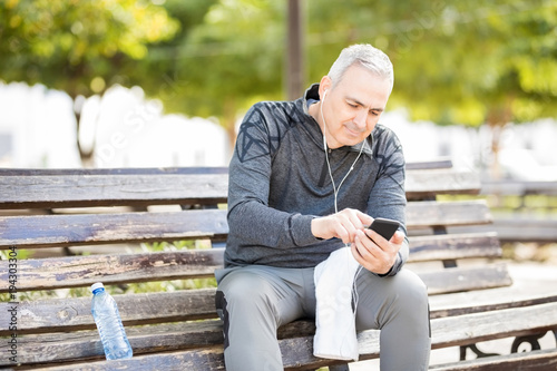 Middle age man listening music after workout