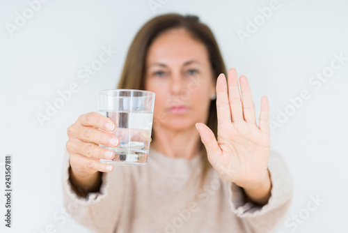 Middle age woman drinking glass of water isolated background with open hand doing stop sign with serious and confident expression, defense gesture