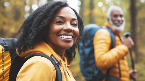 Middle aged african american couple hiking in the woods smiling at camera with toothy smile