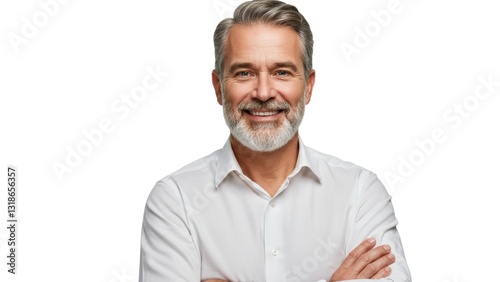 Middle aged Caucasian man smiling, wearing white shirt, in studio setting Represents confidence, leadership, and professionalism