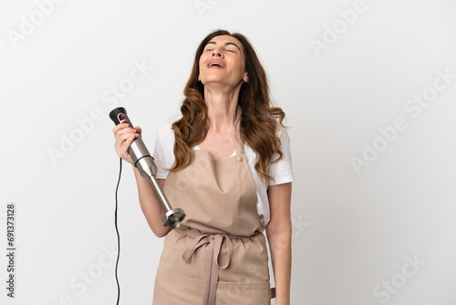 Middle aged caucasian woman using hand blender isolated on white background laughing