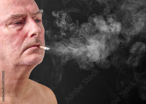 Middle aged man smoking a cigarette,as thick unhealthy smoke flows from his mouth,England,United Kingdom.