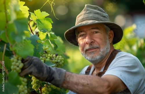 Middle aged man works in vineyard, plucking grape leaves gently, wearing hat and gloves, focused on task