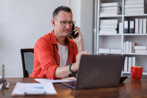 Middle aged manager ceo using cell phone mobile apps and laptop. Digital technology applications and solutions for business development businessman holding smartphone sitting in office.