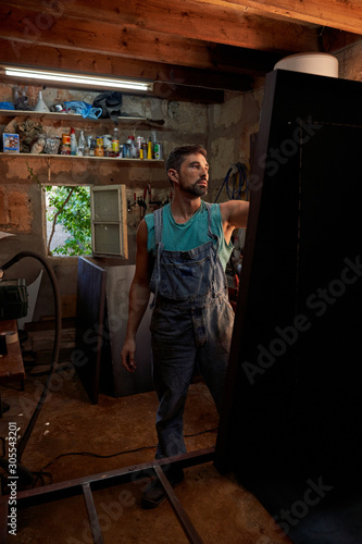 Middle aged skilled man in denim overalls working with furniture in workshop