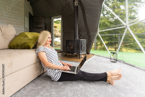 middle aged woman uses a laptop resting and spending time at Glamping house on holidays. holiday dome tent. Cozy, camping, hygge, lifestyle concept