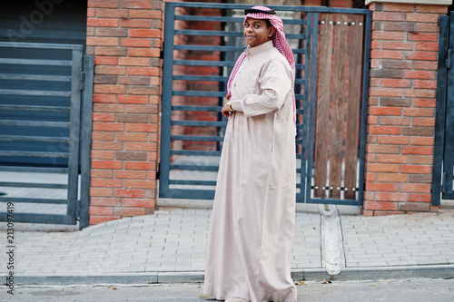 Middle Eastern arab man posed on street against modern building.