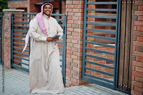 Middle Eastern arab man posed on street against modern building with tablet at hands.