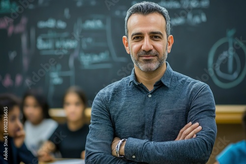 Middle-aged male teacher standing in front of a chalkboard with students in the foreground
