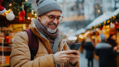 Middle-aged man smiles while using a smartphone during christmas.